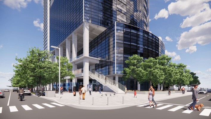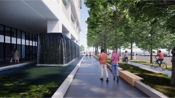 都發局長吳文彥說明,特貿三南基地南案兼顧城市美學、公益共享與環境永續,不僅規劃設置331坪「智匯學院」與320坪「托育家園」等公益空間,也引入國際建築大師安藤忠雄設計的光影美術館與水景空間,並預計取得鑽石級智慧建築與銀級綠建築標章。全區建蔽率55.71%,綠覆率超過76.9%,基地臨復興三路側退縮建築留設20米戶外廣場及人行道,以整合復興三路右轉專用道供車行使用,創造人車友善空間,並以立體通廊串連特貿三北側基地。另與南基地北實施者共同認養周邊公有人行道及與成功特殊學校間長達350米的開放綠帶,打造水綠共融的人行環境。