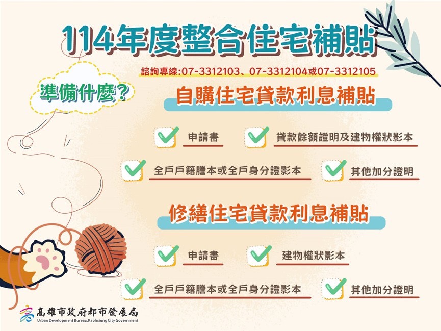 【高雄訊】114年度自購住宅貸款利息補貼及修繕住宅貸款利息補貼,即日起至9月30日止受理申請,歡迎在高雄市有購屋或修繕房屋需求,且符合資格之民眾把握機會踴躍申請。