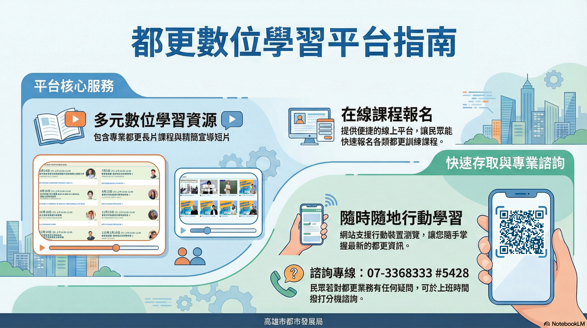 都發局局長吳文彥指出,許多長輩或屋主因不了解法規而對都更卻步。市府打造「高雄都更數位學習平台」,將歷年講座與宣導內容轉化為易懂的影音短片。民眾只要透過手機進入平台,就能像看YouTube一樣,隨時隨地學習都更知識,讓複雜的程序變得簡單易懂。