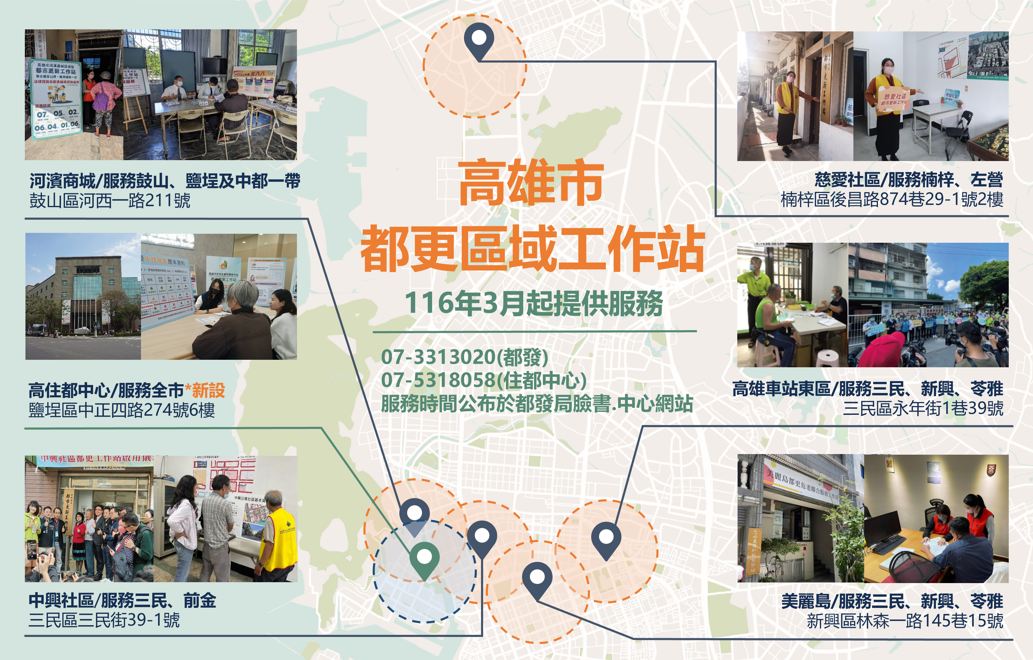 另外,都發局將於3月啟用第六處區域型工作站,由高雄市住宅及都市更新中心營運。除原本的週間下午時段外,首度加開每週三晚間6點至8點的夜間服務。加上既有的五處假日工作站,無論是平日下班或週末休假,市民都能找到最適合自己的諮詢時間,解決「問不到」的困擾。
